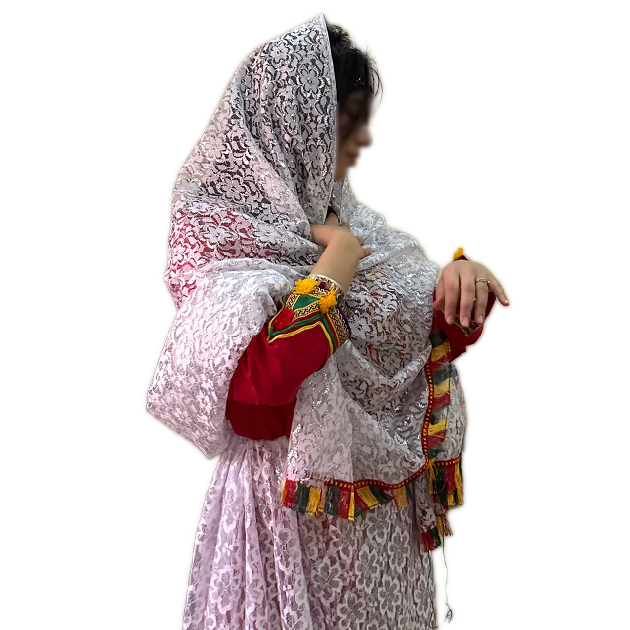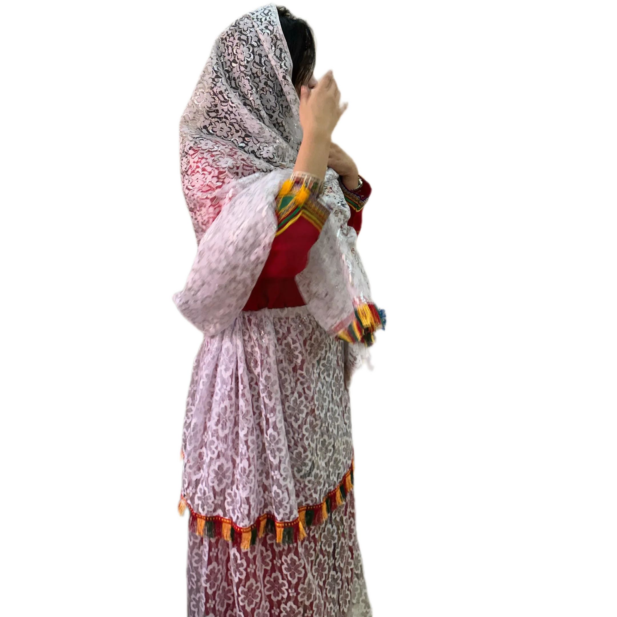 تصميمو مميز بقماش خفيف وراقي، كييعطي إحساس بالأنوثة والنعومة، مع تفاصيل تقليدية أمازيغية فالأكمام والحواشي مزينة بشرّابات ملوّنة ولمسات يدوية زوينة اللي كيعطيوه طابع تراثي أصيل.
